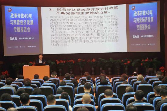 本次报告会上,陈永杰以《民营经济40年发展:根本改变中国,深刻影响世界》为题,对改革开放40年来我国民营经济发展的伟大成就、宝贵经验与启示以及当前民营经济发展面临的机遇、挑战与应对措施进行了深度解读。