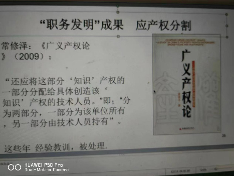 其一,建议实行“职务发明”成果“产权分割”。拙著《广义产权论》(2009)曾提出:“还应将这部分‘知识’产权的一部分分配给具体创造该‘知识’产权的技术人员。”即;“分为两部分,一部分为该单位所有,另一部分由技术人员持有”(常修泽:《广义产权论》,中国经济出版社,2009)见图9