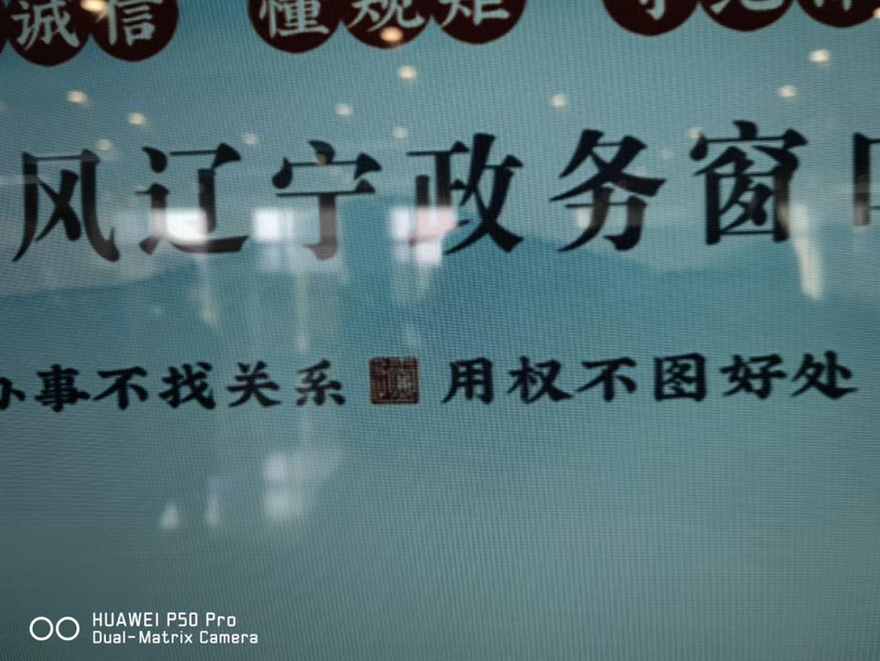 在政务服务中心大厅,见一这条标语:“办事不找关系,用权不图好处”,很高兴,有针对性(见图14)。