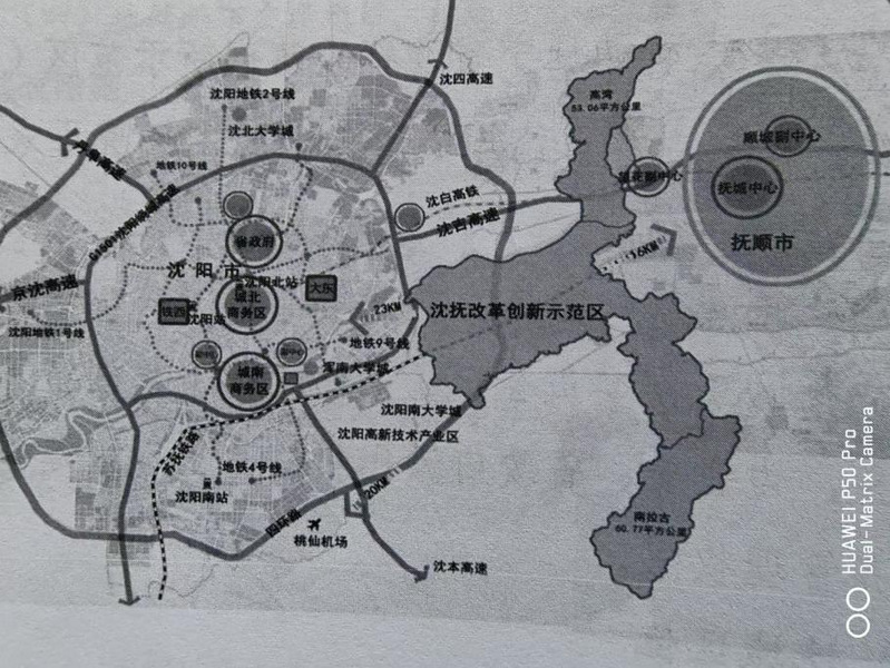 该示范区位于沈阳市和抚顺市两城之间,西距沈阳市中心23公里,东距抚顺市中心16公里。据介绍,示范区由沈阳、抚顺两个片区“托管”而成,面积285平方公里,常住人口约17.2万人(地域见图2)。