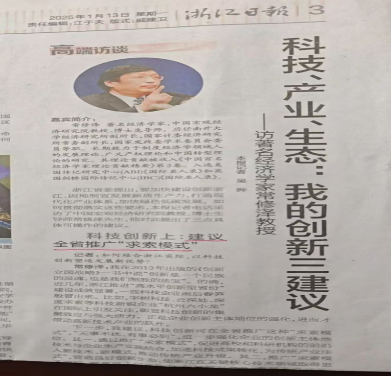 去年我四下杭州,了解到那里有“六小龙”,包括“宇树科技”、“游戏科学”、“强脑科技”、“云深处”、“群核科技”,特别是Deepseek(“深度求索”)。这些创新探索给我深刻启迪。今年1月上旬,应《浙江日报》访谈之约,基于调研我提出“创新三建议”,其中第一条,就是“建议全省推广‘求索模式’”(1月13日《浙江日报》公开发表,下图)。