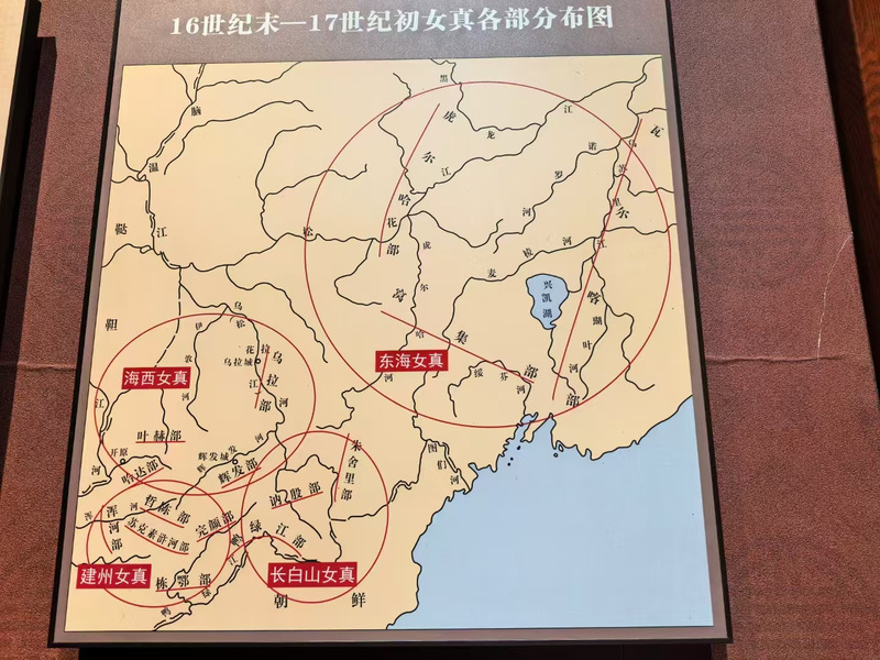 在“建州女真历史馆”得到印证:16世纪末,东北有4个女真:东海女真,海西女真,建州女真,长白山女真,最后“建州女真“做大,统一各部(图17)。
