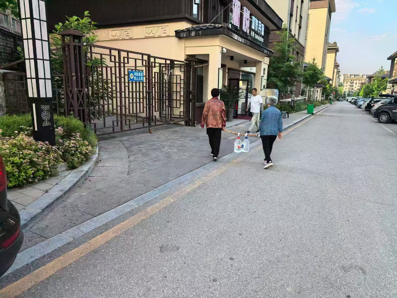 今晨,见俩妇女抬两大桶矿泉水行走,不少人也抬水,小镇一道风景线。(图25)