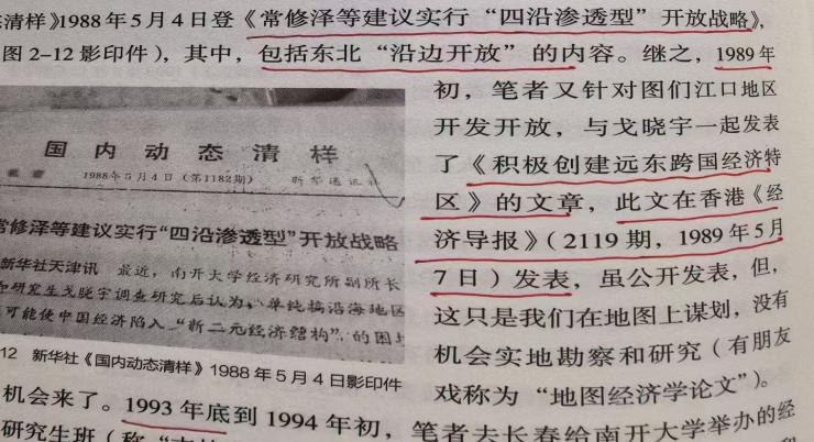 继1988年首提“四沿开放”战略后,1989年针对图们江开发,本人又与戈晓宇提出《积极创建远东跨国经济特区》,并在香港《经济导报》发表(见图22)。这是我的“图们江初心”。