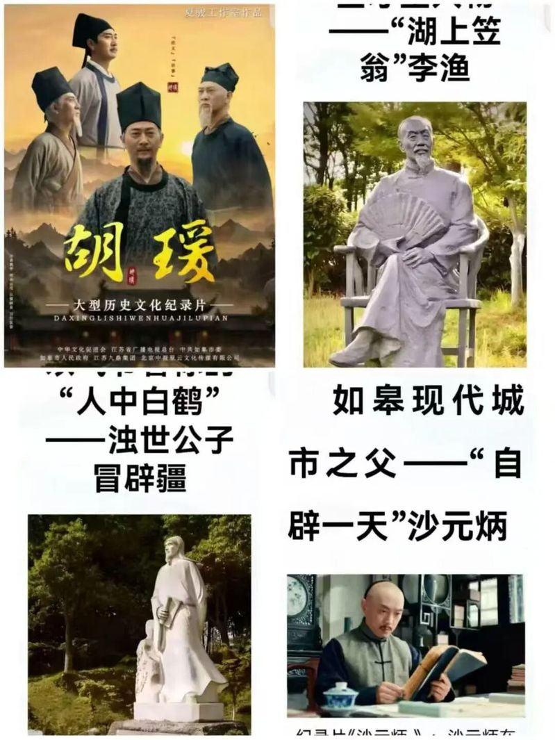 图4.这4位被称为“如皋四贤”:1.北宋思想家、教育家胡瑗;2.明末清初戏剧家、美学家李渔;3.明末清初文学家、爱国志士冒襄(巢民,字辟疆);4.清末民初教育家、实业家沙元炳。看,这是何等深厚且独特的文化底蕴!