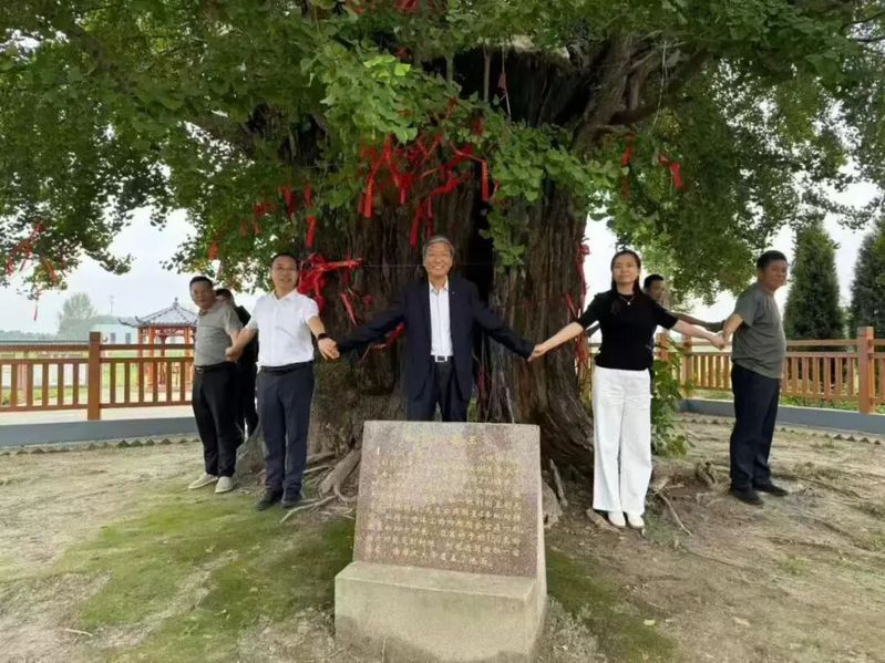 图6.这里有棵古银杏树,据县志记载,此树为雄性,树龄已有1570余年。现树高30米,树干粗处胸围8.7米。看!我们九个人手拉手勉强合围!